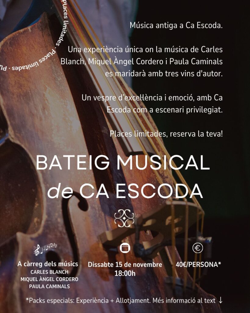 El proper dissabte 15 de novembre, Ca Escoda tanca la temporada d’esdeveniments per preparar-se per a la que ve, recollir-se i donar la benvinguda als artistes que vulguen crear des d’un lloc íntim, tranquil i rodejat de natura. Ho fa amb un bateig musical a càrrec de Carles Blanch, Miquel Àngel Cordero i Paula Caminats, amb maridatge de tres vins d’autor.