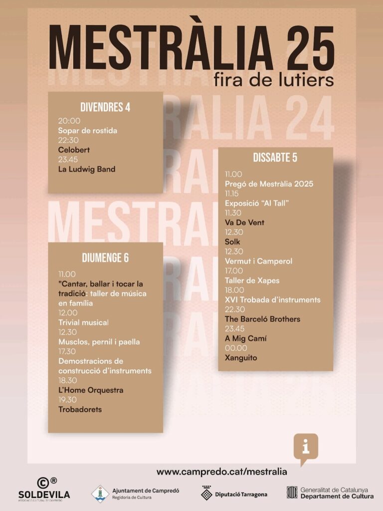 Mestràlia començarà el proper divendres al vespre amb un sopar popular de rostida i una primera nit amb una aposta clara pel que fa a la música en directe i en català: a les 22:30h, Celobert, una formació recent de músics joves que mescla l’indie-pop amb el jazz, i a les 23:45h, la Ludwig Band, un dels grups de referència actual en l’escena catalana, que va esgotar estrades a la sala Apolo de Barcelona fa unes setmanes. Els concerts son una part vital de la Fira i tots son gratuïts. El dissabte a la nit serà el torn de The Barceló Brothers a les 22:30h, que porten per bandera els sons del mediterrani. Després, A Mig Camí a les 23:45h i els mallorquins Xanguito a les 00:00h. Durant els dies de Fira hi ha programats també tallers per als més menuts, demostracions, exposicions i trobades d’instruments, a més d’una exposició dedicada al grup valencià Al Tall.