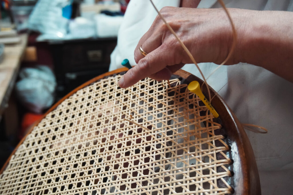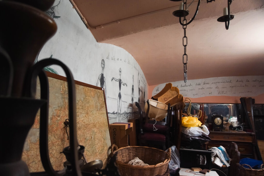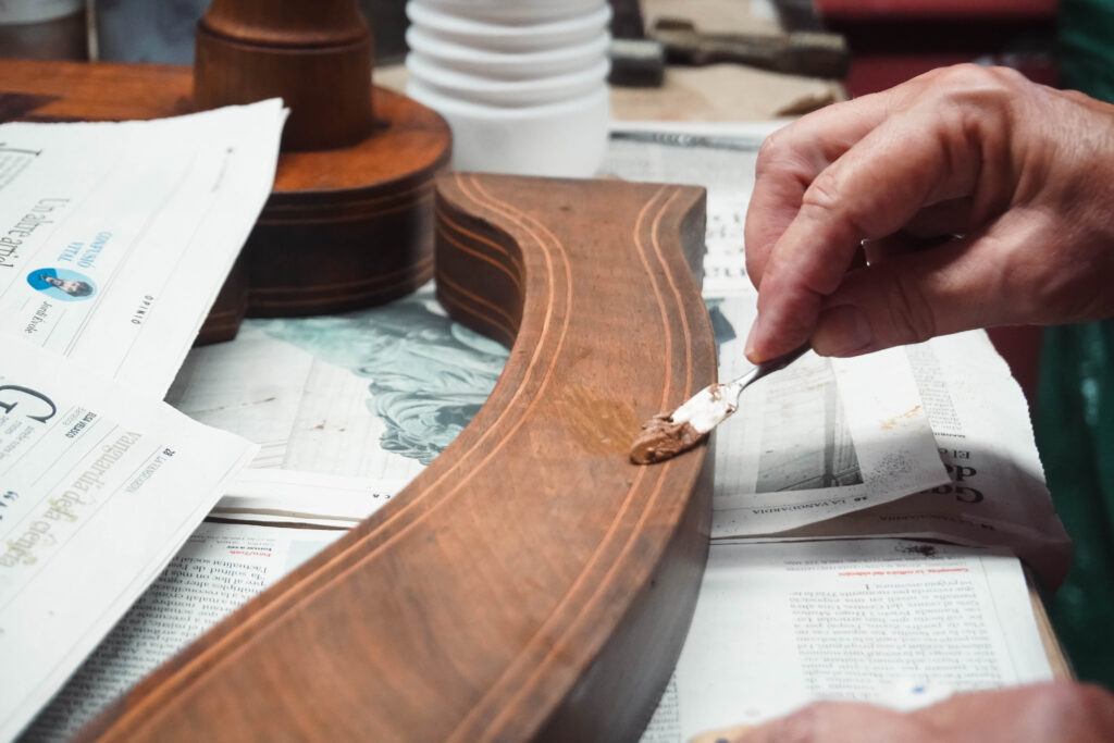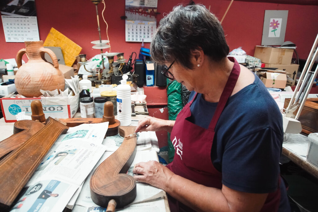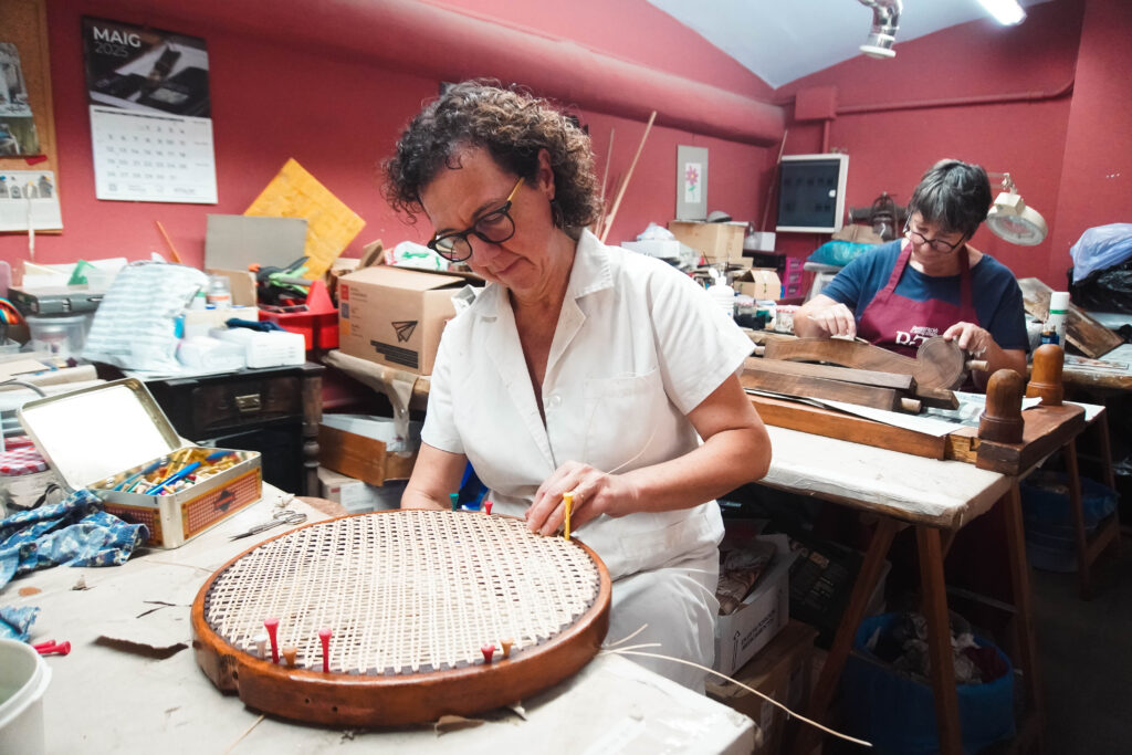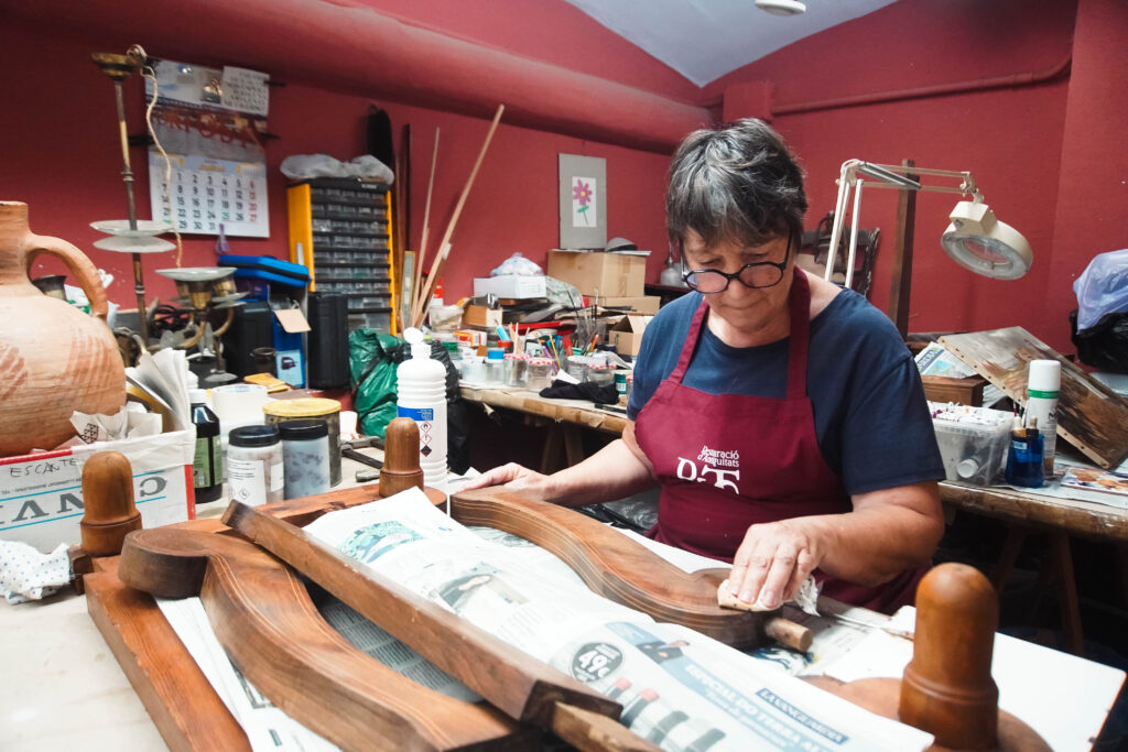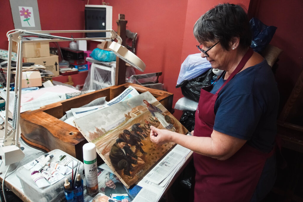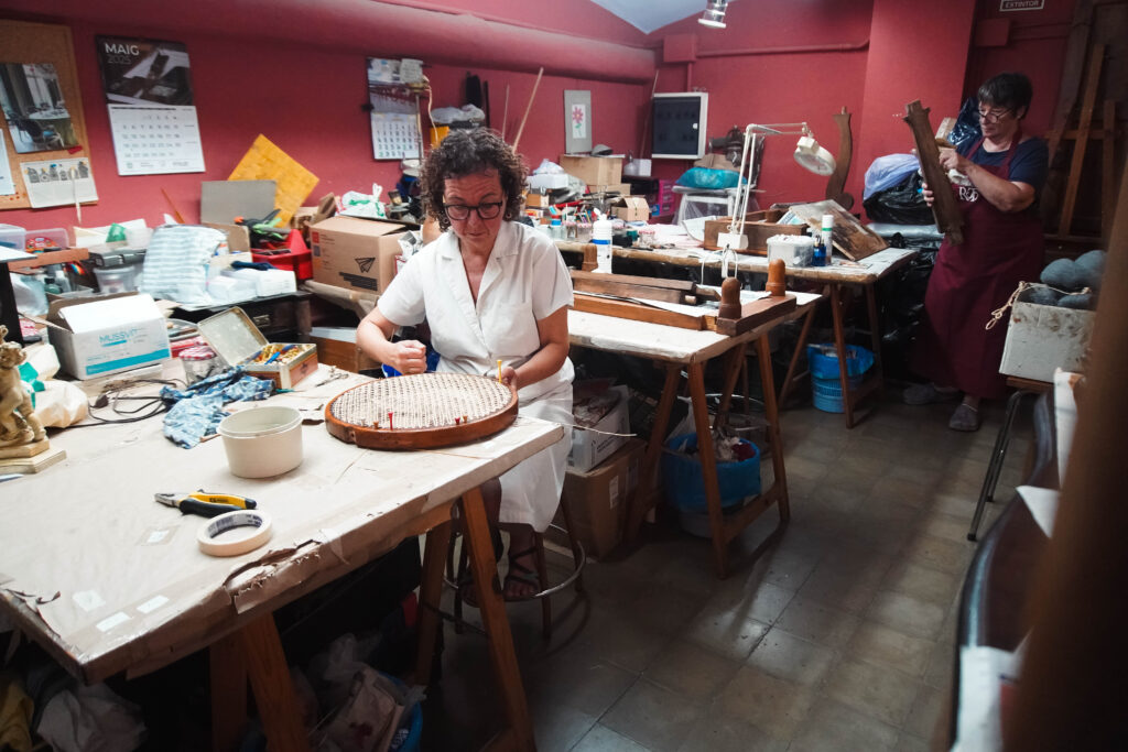Al taller, cadascuna té un espai per treballar. Assegudes en uns tamborets marrons, avui Pagà restaura una pintura que té, més o menys, uns cinquanta anys. La faena de restauradora és molt específica i requerix de coneixements concrets aplicables a cada treball, però l’objectiu, expliquen, és que no es note que s’hi ha intervingut. “Procurem restaurar respectant la peça, mai volem fer un objecte nou. A un quadre no hi pots pintar per damunt, només s’han de repassar les faltes, el que ha caigut. Consolidar, estucar i integrar. Tocar-ho el mínim possible. I així amb tot, amb una calaixera, una màquina de cosir, una cadira…”, conta Pagà.
