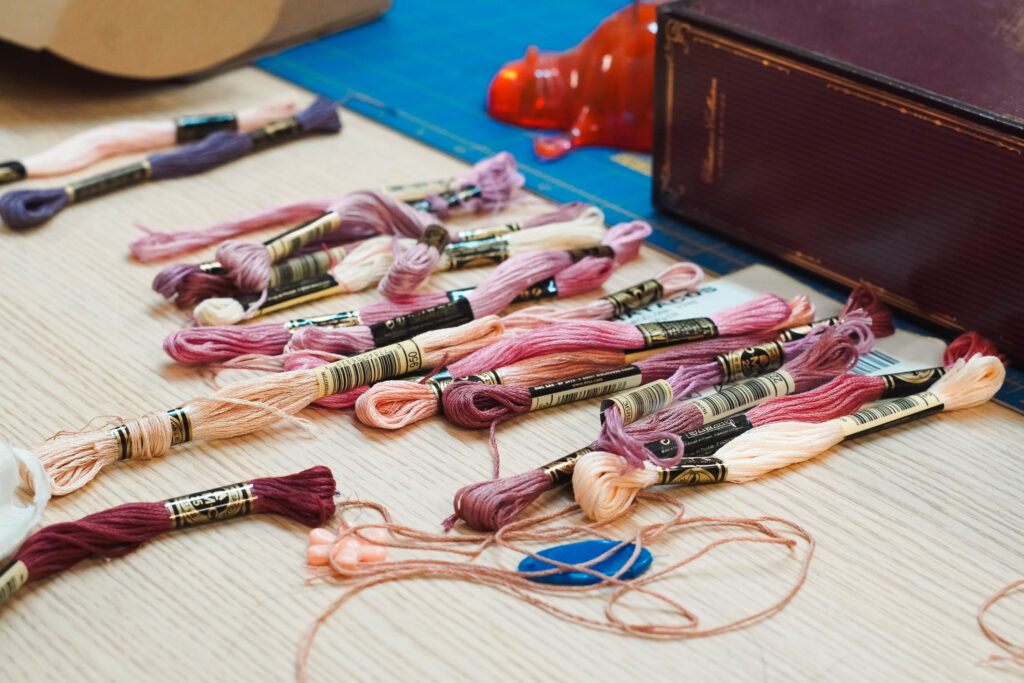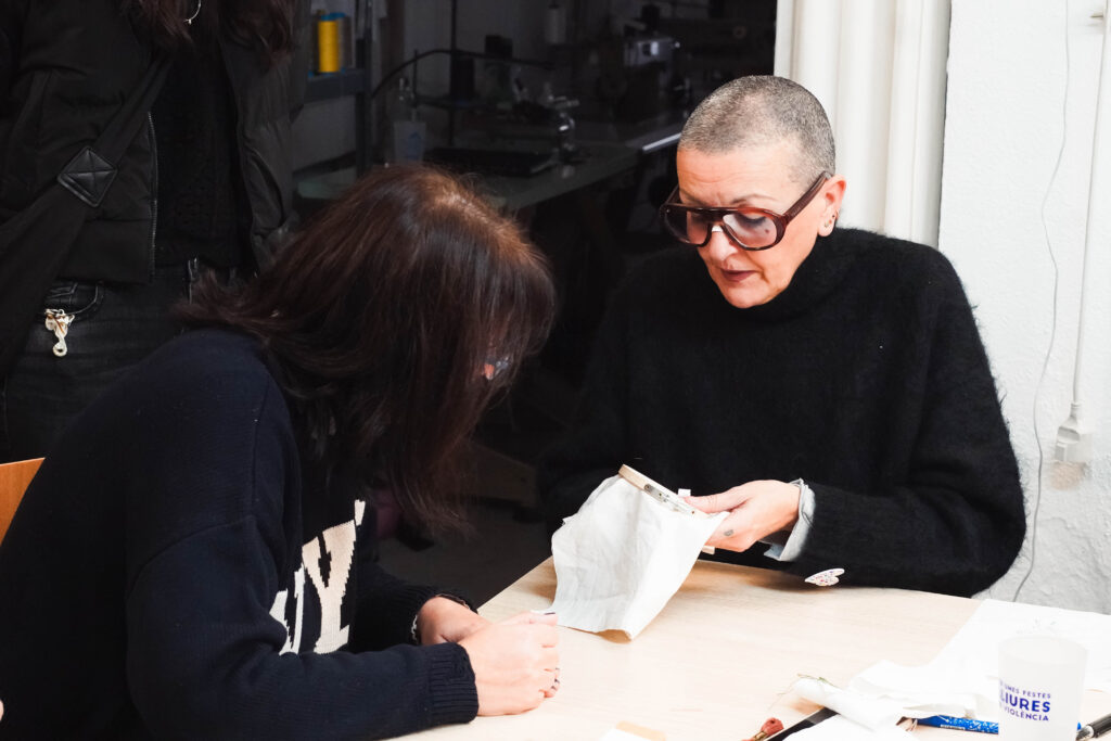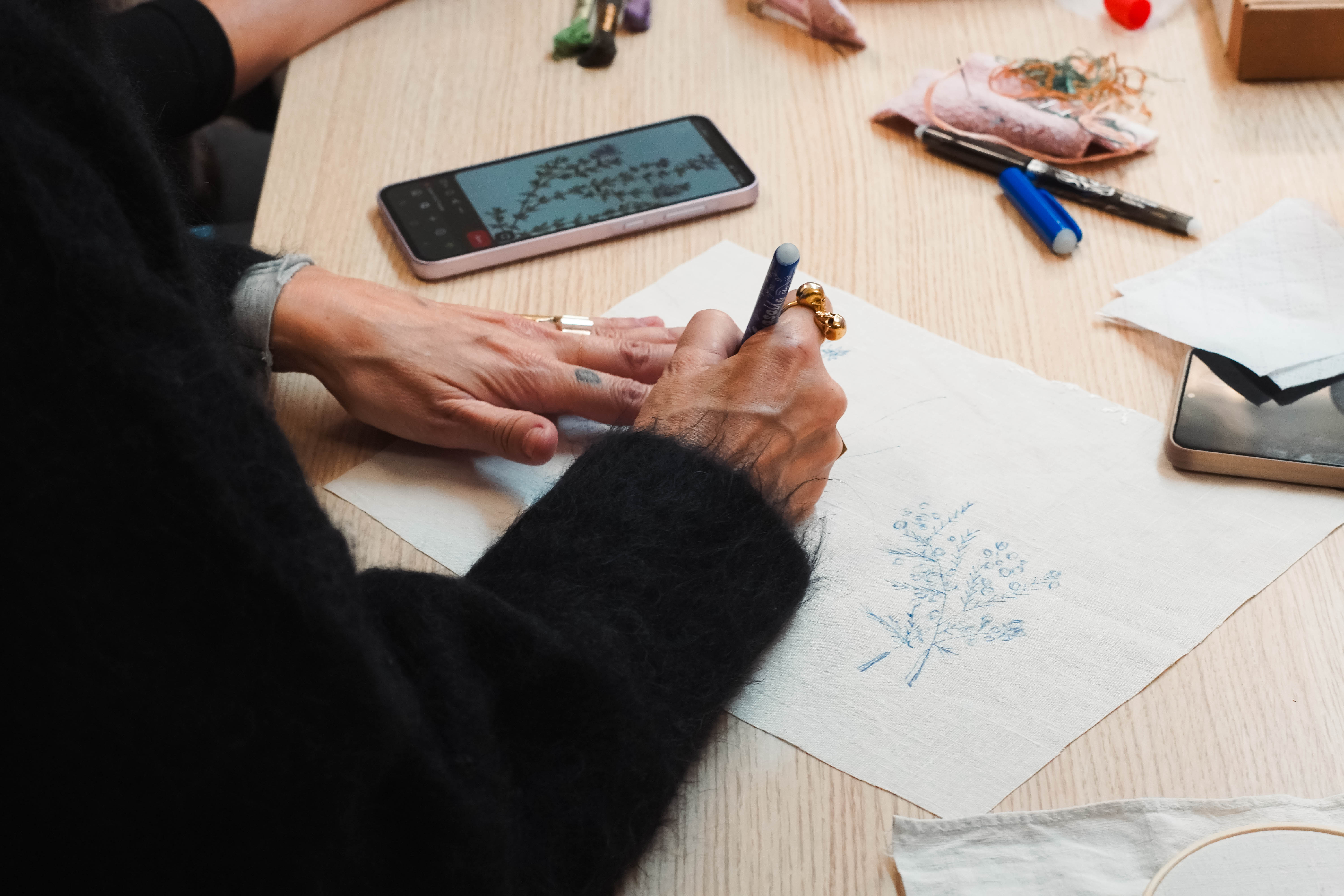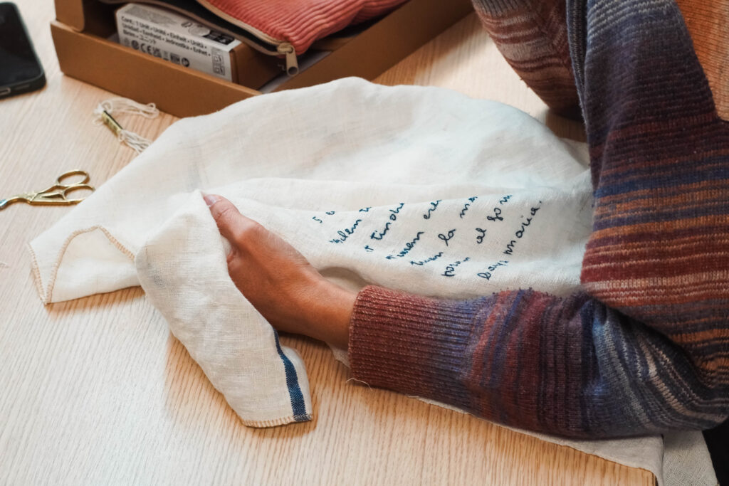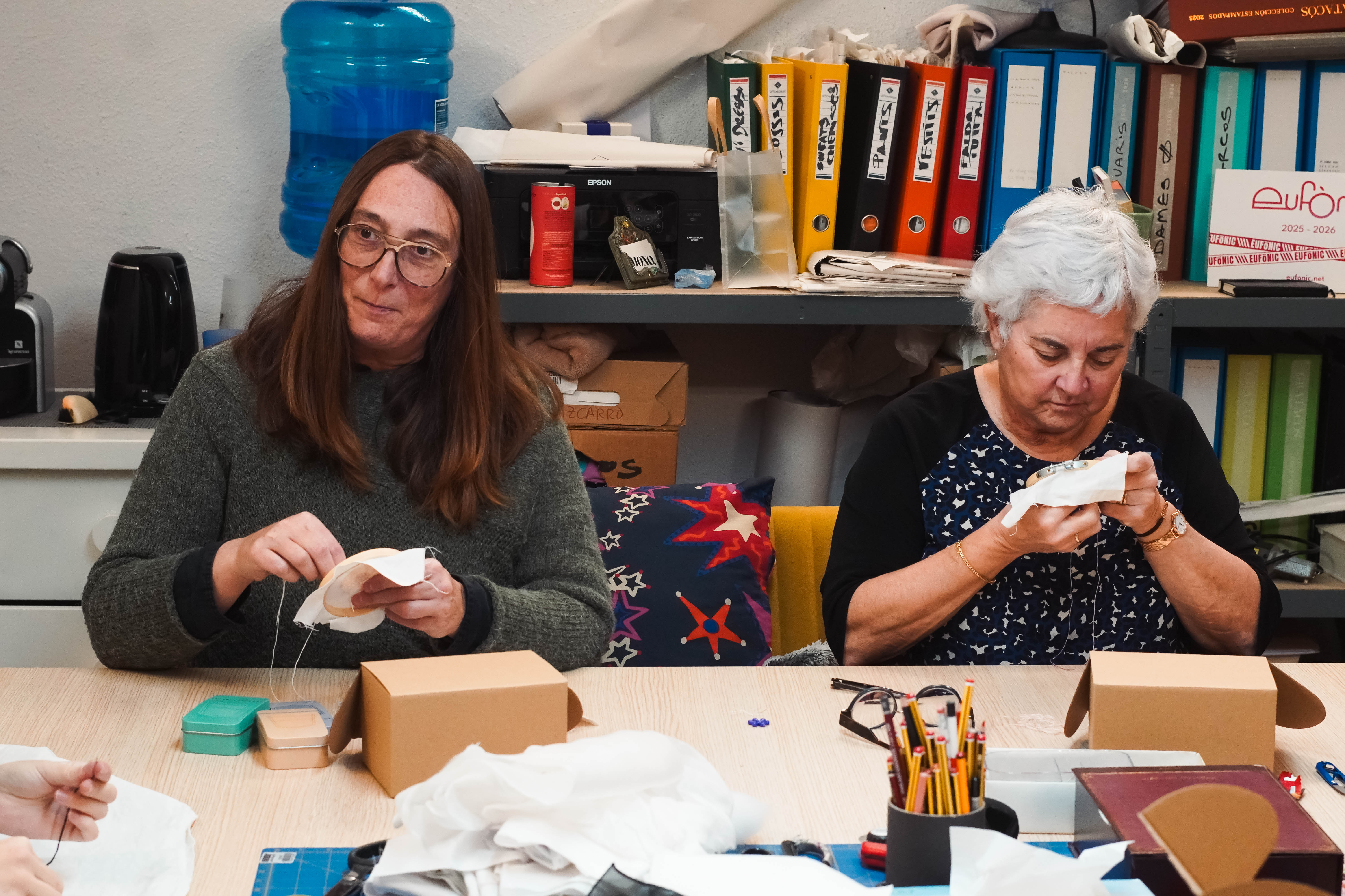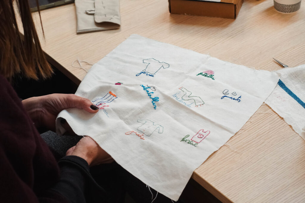 Com que el nivell d’expertesa varia en cadascuna, algunes de les brodadores aprofiten este temps per acabar labors que han començat a Lo Fil de la Vida, un altre dels cursos que s’impartixen a l’OVERlook. Este en concret va començar al 2023, inspirat per “pels brodats de la Sarah Espeute, los mantels i demés xapapotes d’Ivan Forcadell, los plats mítics dels restaurants de la Rapita als 70s, la vaixella del Cranc Roig, les auliveres i les galeres i de la necessitat de contar una història en allò que sabem fer: enfilar i cosir”, com Vizcarro va anunciar a través de les seues xarxes. Sobre teles antigues, cadascú hi broda el que li ve de gust. Això sí, ha de tenir algun significat, ha de ser més que un disseny bonic. Passejant els ulls per la gran taula comunitària s’hi poden apreciar receptes de les iaies, de les mares, en les seues mateixes cal·ligrafies, o dibuixos de quan els fills eren menuts. Una manera d’unir la creació antiga amb la recent.