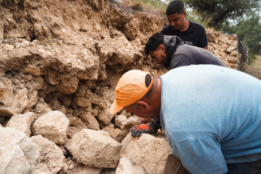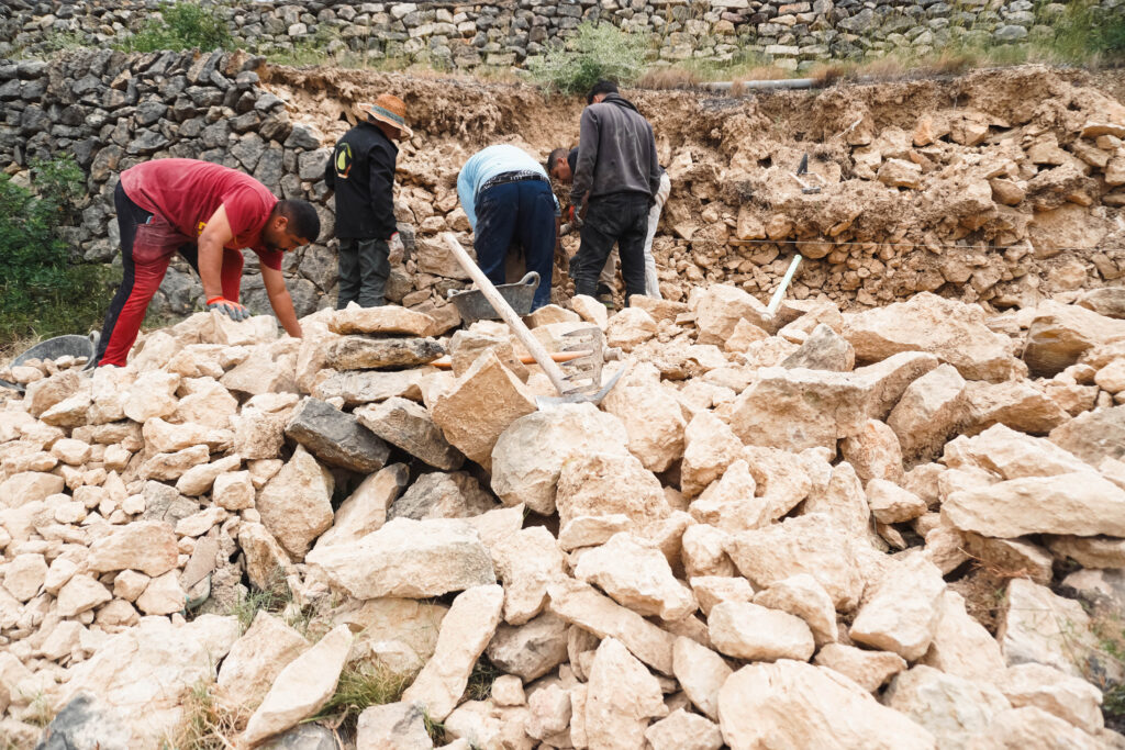 Celso Pla Cid és un dels voluntaris de la Cooperativa Terram. Va jubilar-se fa uns mesos, convençut que a la vida hi ha moltes altres coses a banda de treballar. Però fer i reconstruir marges de pedra seca no és una faena, per a ell, sinó que és quasi un deure. Vol traspassar este coneixement, esta manera de fer, perquè no hi ha relleu generacional als camps i, per tant, les tasques que no son estrictament agrícoles també s’acabaran perdent. Estos dies treballa, amb l’ajuda d’altres integrants de la cooperativa, en una finca privada a prop de l’ermita del Coll de l’Alba de Tortosa. L’aigua dels últims mesos ha fet que el mur cedís, tot i que les panxes que s’aprecien al llarg de la construcció indiquen que l’aigua porta anys escolant-s’hi i malmetent-lo.